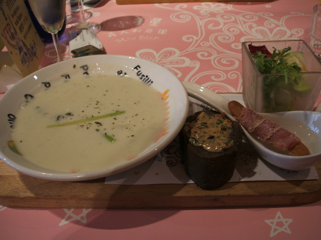 今天所提供的湯品為蛤蠣,搭配著墨魚麵包佐鵝肝醬、生菜沙拉與裹著餅乾的生火腿,很精緻且味道還蠻不賴. (但火腿的鹹度,吃不太習慣.)