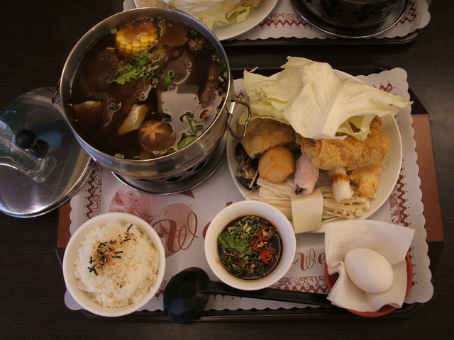 特製牛腩鍋:菜盤、蛋、主鍋,湯的味道還可以,不會很重口味,但有些鹹。重點是肉,每一塊都很大,也燉著很嫩很入味喲!正常男生而言,這一樣一份就夠飽了,尤其那牛腩肉,約四五塊以上,難怪大家一致公認最實惠好吃的一道!