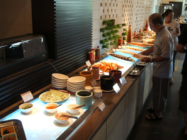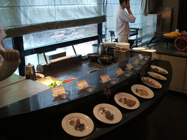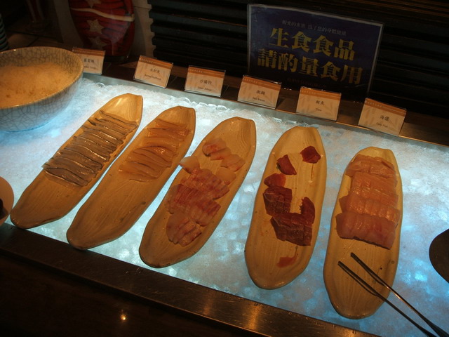 鐵板區:豬、牛、雞、鮭魚等類,雞肉不錯吃,牛肉太老,而鮭魚很乾。