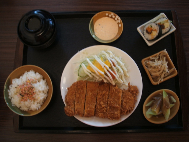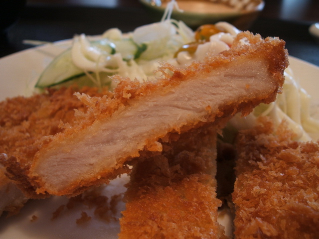 豬排定食:一大塊炸豬排,附三樣小菜&湯品。豬排份量雖厚,但肉質偏硬且乾,但沾其沙拉醬,可補其乾硬的口感。