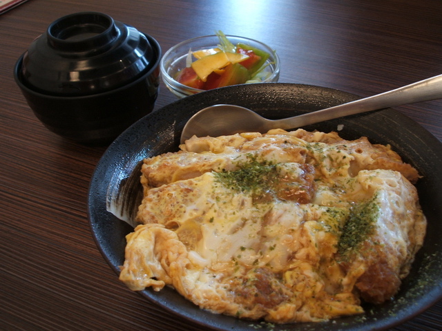 豬排蓋飯:可選套餐(附沙拉、湯品),因屬親子丼作法,醬汁已滲入豬排內,但口感比豬排定食的豬排好吃多嚕!