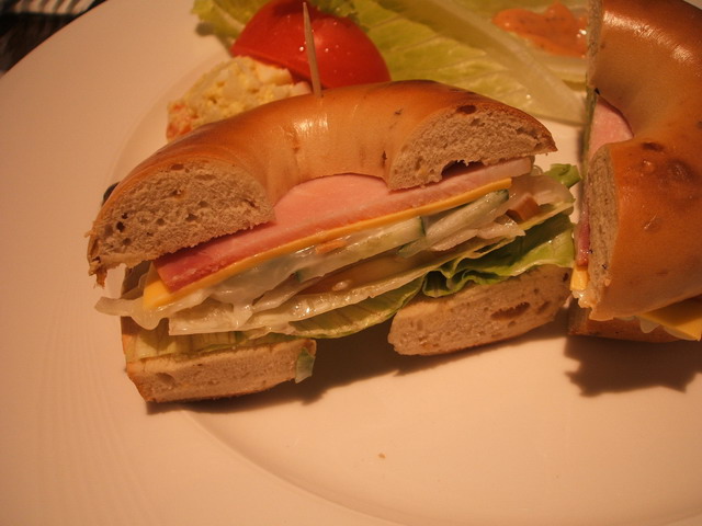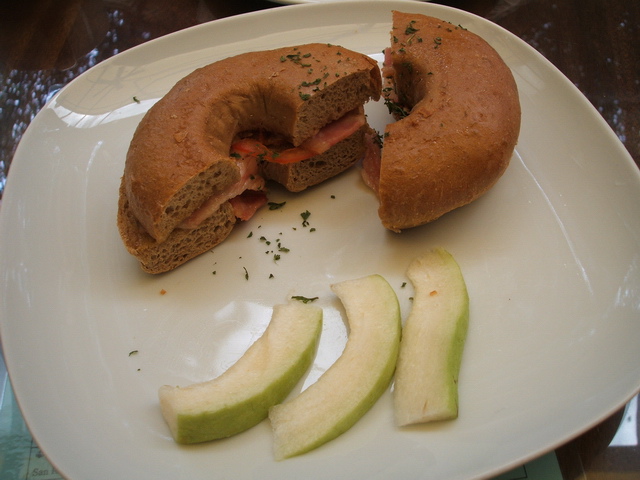培根貝果:熱熱的焙果,口感很讚,很Q咧~只是內餡可讓葉子傻眼一下,很單調的一片培根+蕃茄片!與Nook的差距頗大(若跟魚羊比,應該差更多)。但魔女安慰葉子說:「你貝果的蔬菜就是一開始的生菜沙拉啦!」..一.一a