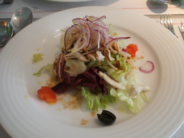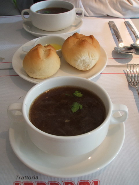 濃湯&麵包:今日為洋蔥濃湯,味道適中(不是濃稠漾),還不錯喝。麵包微沾著濃湯喝,比起提供的油醋味道好上許多。