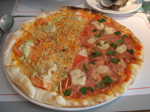 義式Pizza:選擇L size (12吋),葉子選擇兩種口味「鮮蝦&帆立干貝」「莫塔黛拉火腿蕃茄馬自拉起士」搭配。葉子很喜歡那熱騰騰的起士搭配蕃茄火腿的味道(上一次吃臘腸起士佐蘆筍口味,也是很讚)。當然,海鮮口味也不賴,每一片都有蝦子&干貝。