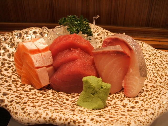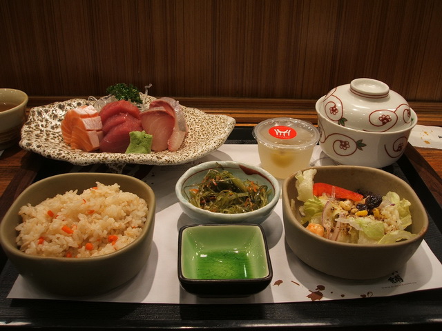生魚片定食:蠻豐盛的定食,有湯、生菜沙拉、冷菜、甜點、主菜。而生魚片共七片(鮭魚*2、鮪魚*3、紅柑*2),鮮度尚可,唯鮭魚的油脂口感令葉子滿意外,其餘兩款魚肉的肉質算中下品質了!尤其紅柑的肉質很垮(沒彈性且軟)。至於配菜,和風口味的生菜沙拉蠻不錯吃喲!而其他就中規中矩。