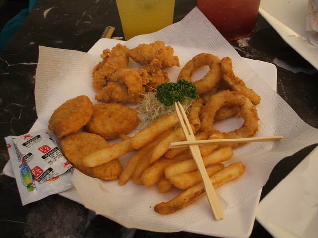 綜合拼盤:份量不多,但炸得也不錯吃,一次可享用四種口味雞米花、洋蔥圈、雞塊、薯條。