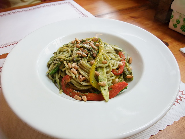 松子青醬義大利麵:收得恰好的青醬,雖然味道不是很濃郁入味,但麵條與醬本身都不錯吃!而且不會有油膩感(當然,也沒有肉食性的滿足感~哈哈)