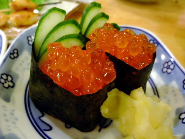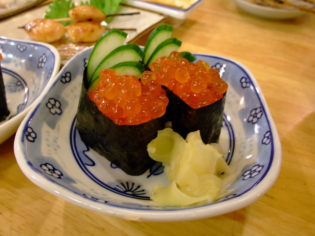 鮭魚卵壽司:魔女瞧著別桌那美麗的鮭魚卵,葉子爸:點來吃看看,葉子:好,點兩份吃看看.....。一口一貫,就是一種爽快的享受!(魚卵品質ok~)