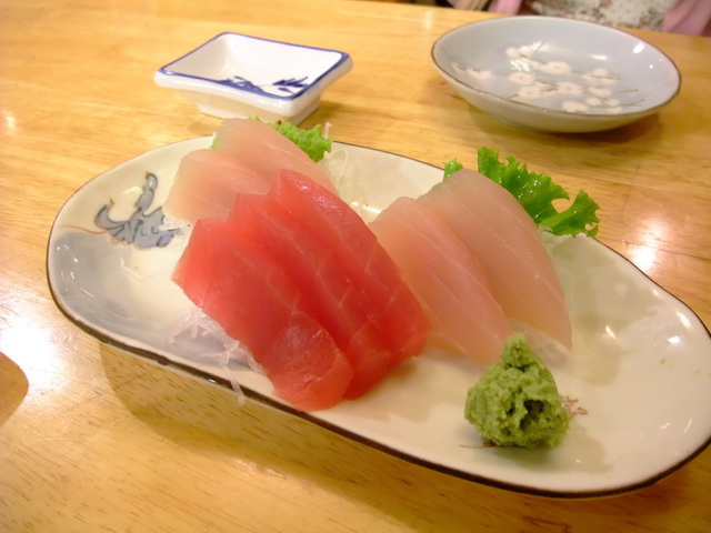 生魚片:葉爸去掉葉子愛吃的鮭魚,只選旗魚、鮪魚兩款,其鮮度OK。(我喜歡鮭魚片啦~)