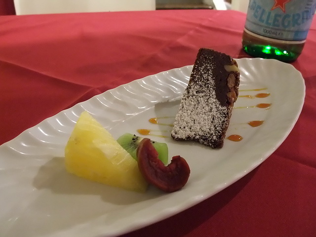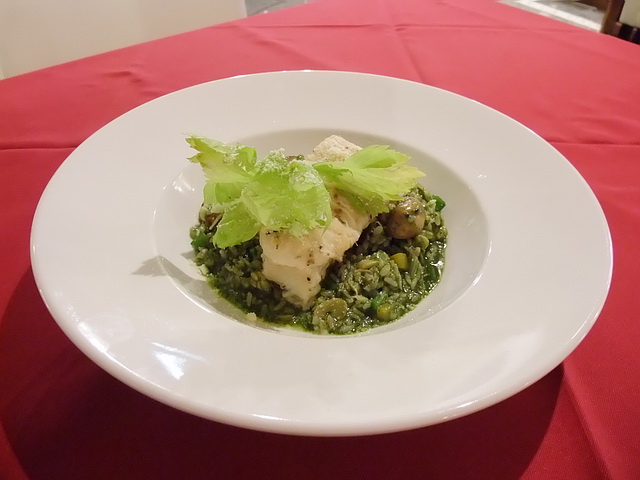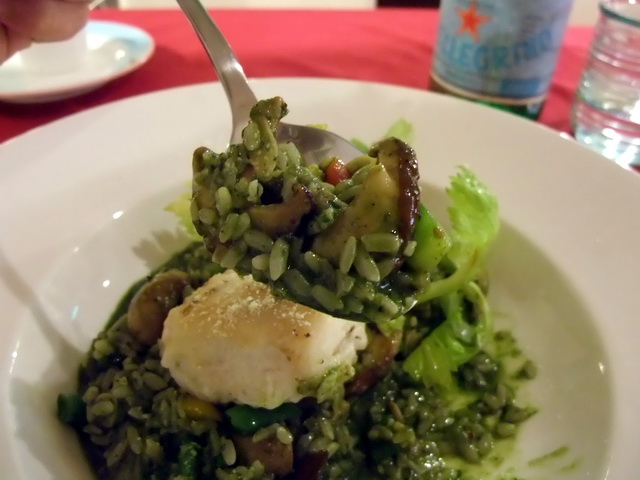 熱那亞風味蠶豆鰈魚蔬菜燉飯:內容為時蔬、蠶豆泥、鰈魚(比目魚)、羅勒醬等。熱騰騰的燉飯,一上桌就冒著一股誘人的香氣,而燉飯的口感較為軟(軟硬度可事先告知喜好,葉子忘記講嚕..),雖如此,但整個青醬與米粒比例很好,與上一次村依里儂吃的燉飯一樣美味!而一整塊的鰈魚,鮮度很棒外,其比葉子愛吃的龍鱈更有口感喲!佐料有芹菜,可以稍微解羅勒醬的膩。最後,再喝一可氣泡水,可使葉子一整個滿足啊!(大樂)