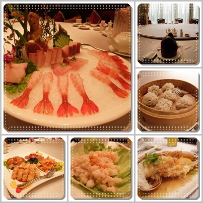 葉子的部門聚餐:鴻運美拼盤、青魽牡丹蝦&酥炸牡丹蝦頭、瑤柱雪蛤盅、生菜明蝦鬆、蒜蓉琵琶蝦、三杯金錢鰻、麒麟石班魚、糯米珍珠丸、御品佛跳牆、蠔油美生菜、港式甜點&季節水果