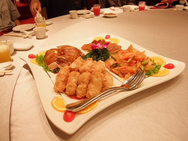 鴻運美拼盤:烏魚子、油雞、蝦捲、鱈魚肝拼盤。四種味道還可以,最好吃的卻是最憨厚的蝦捲,口感十足。