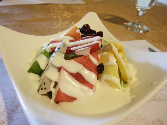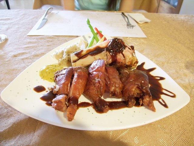 德國鄉村豬腳:皮烤得過硬,肉質乾而略腥,一整個失望!整體而言,就是整個豬腳的火侯沒有控制好,有一些部位尚可入口(膠質嫩而已,肉質部位都很乾)~魔女言:「西堤就不比了,比之前吃的高雄空廚還難吃!」