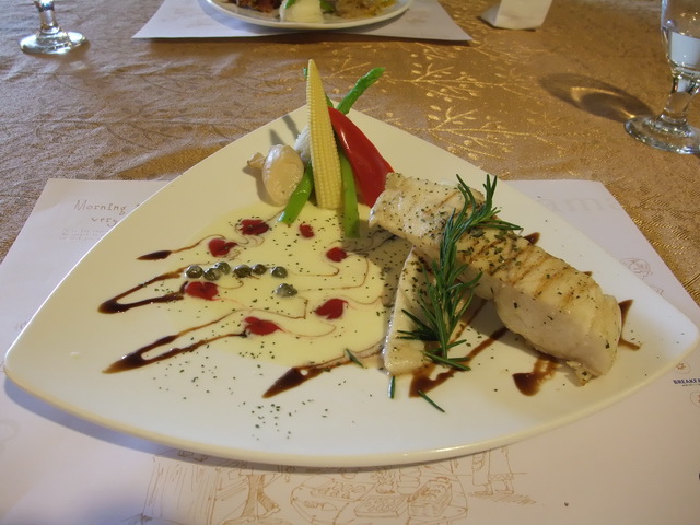 嫩煎圓鱈佐塔香白酒汁:兩塊圓鱈直接微煎,看似可口,其實肉質部位不夠新鮮,且有股油膩感!而店家給的部位魚刺很多(魚刺是葉子的天敵),若與最近於皮耶諾所吃的拿坡里香煎龍鱈魚相比,真的整個被皮耶諾打趴(還便宜許多咧!)
