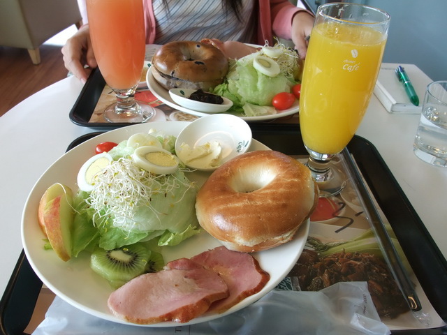 超值早餐組2(柳橙汁、原味貝果佐起士醬、柚香水果沙拉、豬肉片、熱可可)
