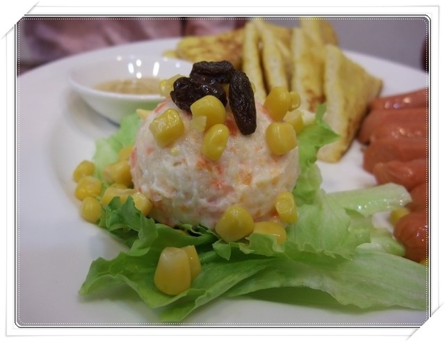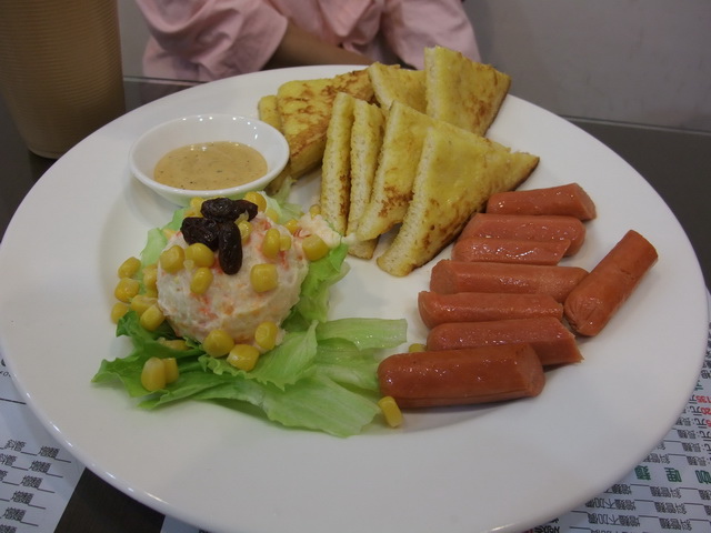 超值元氣早餐($80):有四條熱狗、法國土司、薯泥沙拉、熱奶茶。很普通的一份早餐盤,尤以那份沙拉球,味道很糟糕,不如不要放(魔女:「真的只是好看而已....」);而熱狗與法國土司就還ok,這種東西要難吃也挺奇怪的......主要這份餐點賣$80,葉子還是認為點份總匯吃吃,比較值得些。