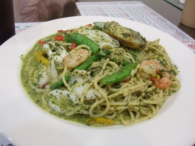 青醬海鮮義大利麵:一般這種店的義大利麵,醬汁都很水,葉子特地交代店家收乾些。青醬的味道不夠濃郁,還是有點水,但麵條的口感還不差,尤其海鮮配料(花枝、淡菜、蝦子),除了淡菜有點腥外,其於都很好。至於份量,可以免費增量(麵),葉子這一盤是有加麵的嚕。