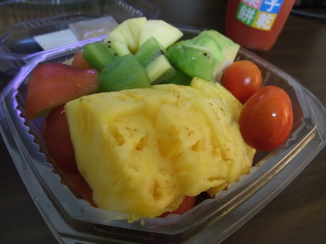 難得前言如此多字,緊接著,介紹最近讓葉子迷上的「水果便當」:精選當日水果數種,有芭樂、蓮霧、鳳梨、蘋果、蕃茄等,至於鮮度方面,葉子覺得很棒(很久沒這樣吃水果囉~)。再者,其會附上一包產銷班的梅子粉,這更是有畫龍點睛的效果,除了與傳統的芭樂對味外,其他都可以沾著吃,尤其鳳梨更是好味!而價格也算適合懶人,一份$60,可以買幾盒當晚餐或隔日早餐,也是很棒的選擇......