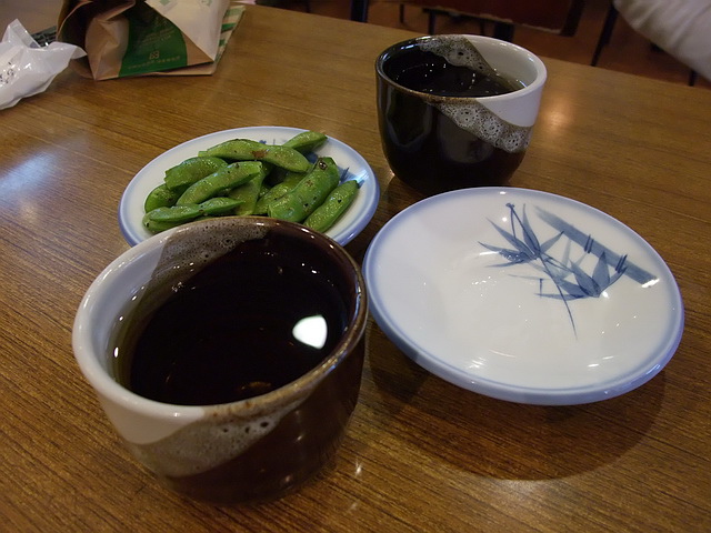 招待小菜 毛豆 和 冰麥茶(為何沒有熱的呢?)