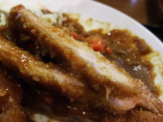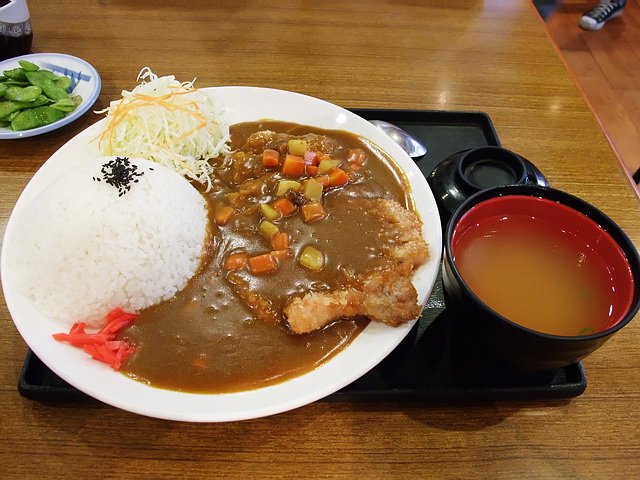 咖哩豬排飯:今天不吃拉麵,吃個咖哩豬排飯(葉子是肚子很餓時,不吃米飯,就不會飽的體質)。餐附味噌湯,咖哩、豬排屬普通等級,不會多好吃,也不會多難吃,類似,會煮咖哩的人都可以做出來的味道吧! (base on 葉子小妹自製咖哩的味道與其比較後的感想)