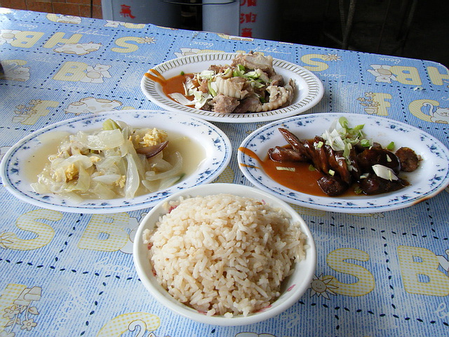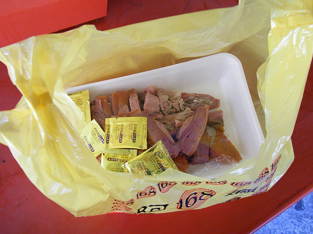 一碗豬頭飯,再搭三品小菜,就是午餐。豬頭飯的味道和口感,說真得,葉子覺得不好吃,不夠香之外,米飯的乾也讓我不知道怎麼吃~_~ 相對而言,葉子對於記憶中的斗六炊仔飯,卻又懷念了一下~XD