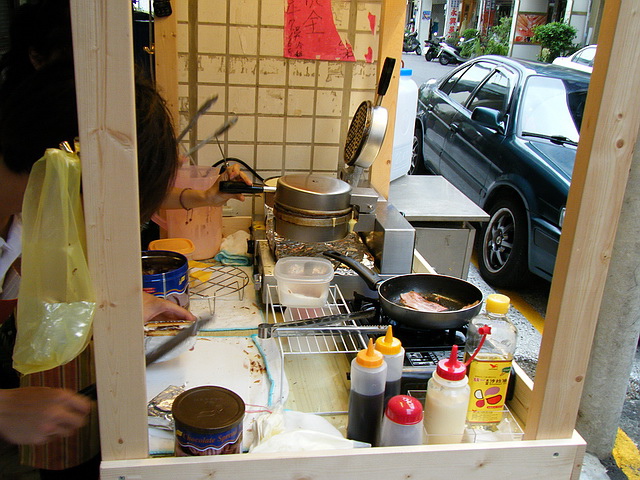 各款鬆餅的製造處,兩台鬆餅機,還有煎肉品的平底鍋和加工平台....