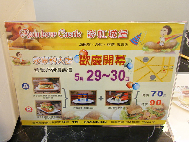 前些日子,經過台南科大附近的新民街,瞧見一個熟悉的扛棒『彩虹城堡』~雖然,它不是葉子&魔女最愛的一間潛艇堡專賣店,但印象也不差。相對而言,對於台南科大的飲食商圈來看,也多了一股新飲食氣象進駐,讓人多了一款選擇!