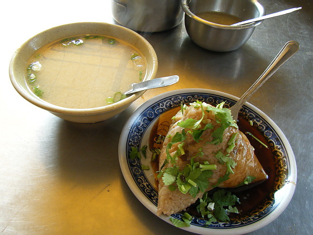 一個人吃飯,就是只有吃小吃的命,上一次讓葉子感動的老黃陽春麵旁,也是一間在地老店『圓環頂菜肉粽』,賣得很簡單,就是菜肉粽、味噌湯、魚羹,客人絡繹不絕,想必味道一定不差!轉眼之間,葉子就來吃個肉粽、喝個湯,打發晨早飢餓的肚子.....![]()