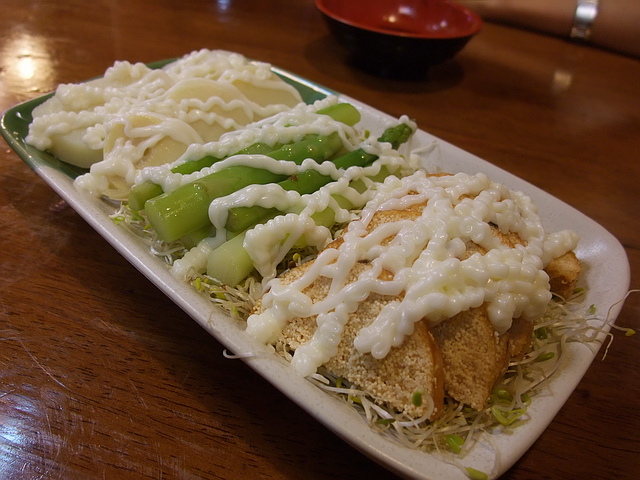 綜合沙拉:魔女指定想吃(魚蛋),但葉子不愛,折衷選擇這一款綜合口味,有魚蛋、蘆筍、鮮筍。