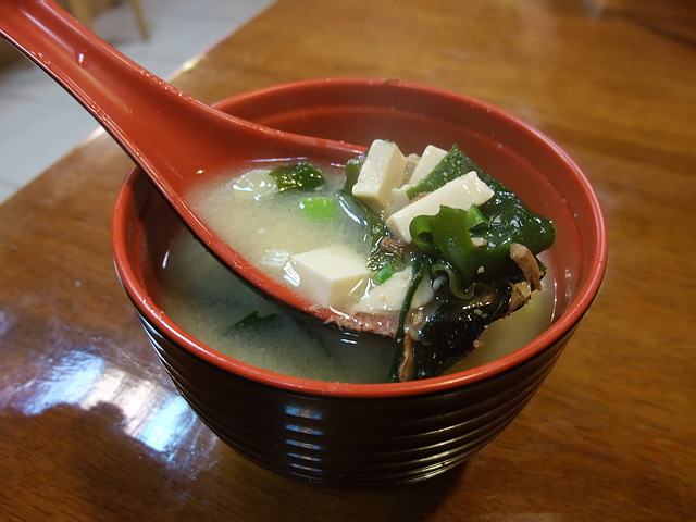 餐點附的味噌湯,實在的湯品,味噌不夠濃外,還真得不錯喝(有料有加分)