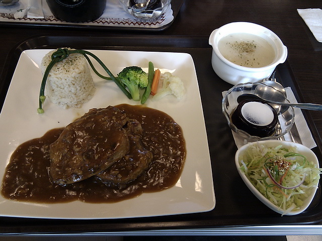啤酒香蒜豬排:生菜沙拉、濃湯、甜點、主餐(飯可免費續用,可惜不是紅麴飯)。