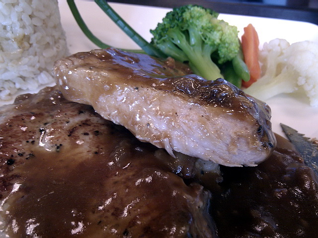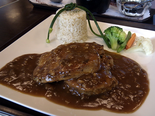 豬排很厚、醬汁帶著啤酒味道,是這款餐點的特色。至於好不好吃,葉子覺得,其餐飲類型,這種品質,可以嚕!