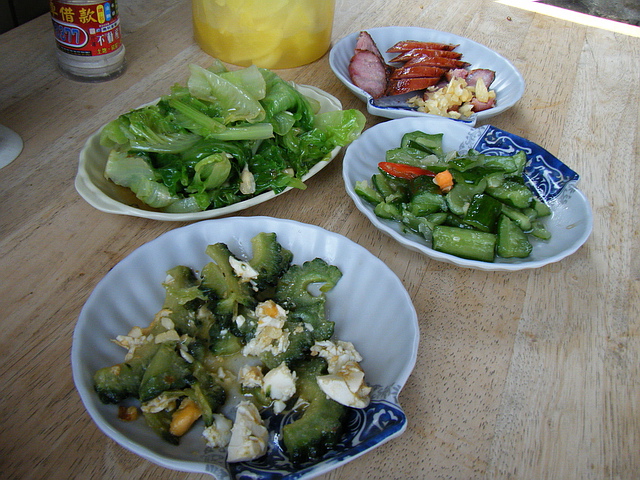 佐餐小菜:香腸、燙青菜、小黃瓜、鹹蛋苦瓜