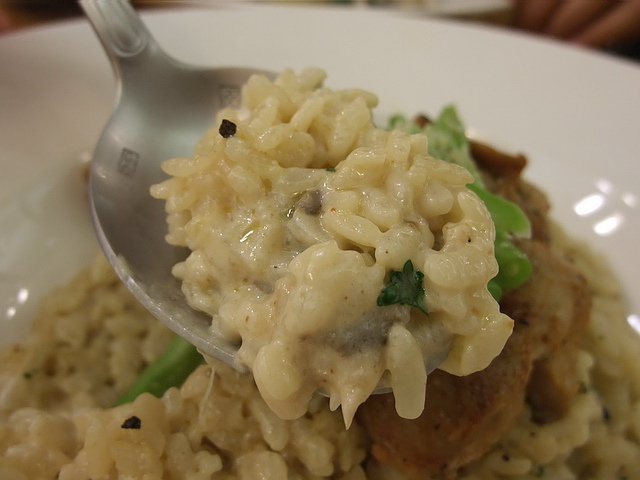 烤嫩雞佐牛肝蕈燉飯:喜歡濃郁口味的,不可錯過這一品。雞肉夠味且嫩,燉飯味道也濃郁~除了米偏濕軟外,此與魔女的蛤蠣麵,都展現不同於美食街的義料味道