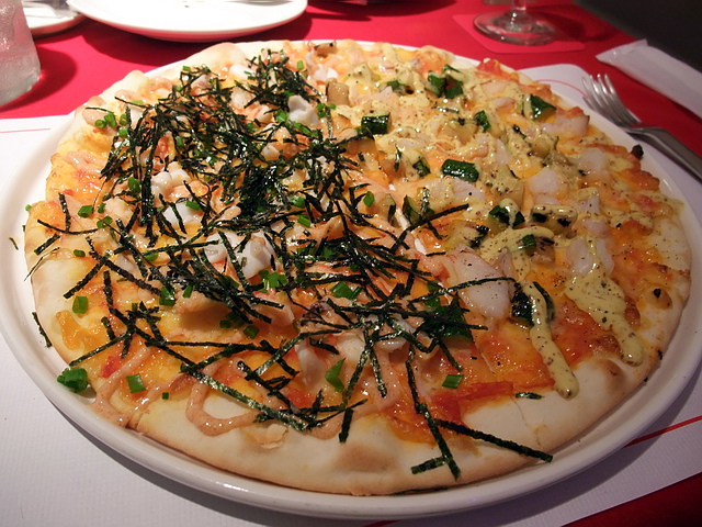 和風明太子墨魚鮮蝦:明太子的鹹香為主軸,配料新鮮沒話說,若說缺點,魔女不喜歡上頭的海苔絲,葉子則覺得可以再烤脆些,Pizza餅皮會更好!