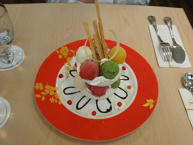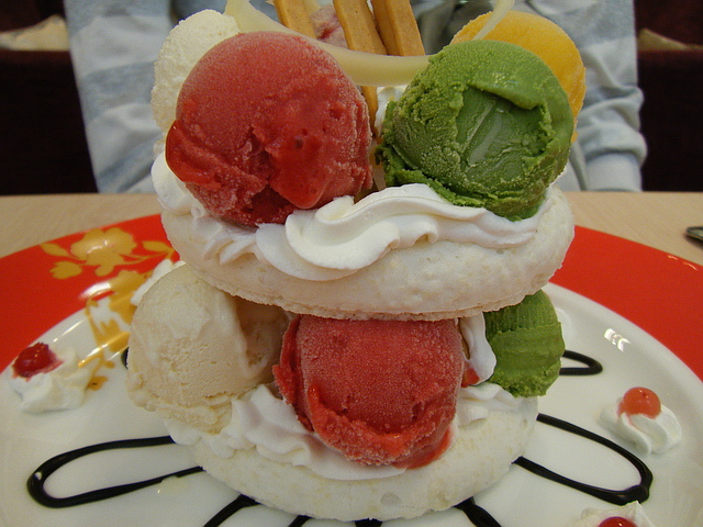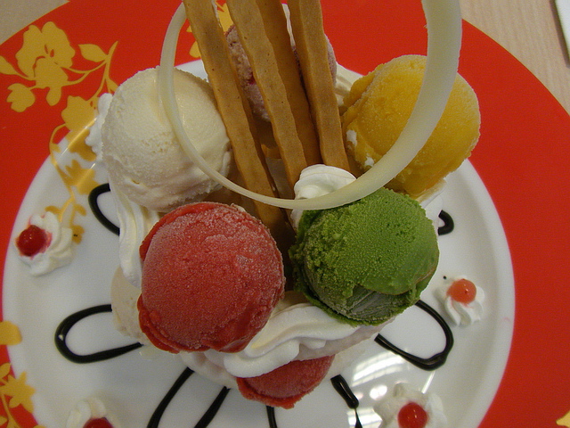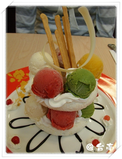冰紛歡舞:有十球冰淇淋,口味為香草、抹茶、草莓、桑果、芒果,撐著冰淇淋的是杏仁脆餅。除了不太好吃的杏仁脆餅外,冰淇淋就是常吃的味道(口味都吃過嚕)。當然,還是要推一下抹茶、芒果兩款口味!