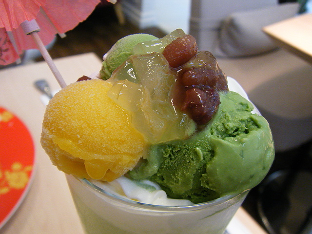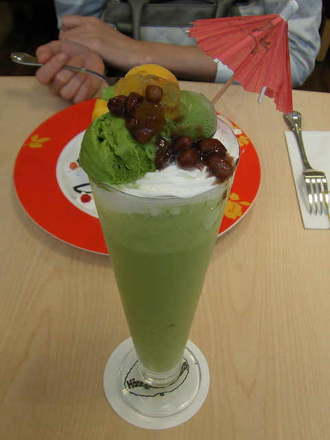 茗香假日:喜歡抹茶的朋友,這一杯可就推薦啦!除了上頭的抹茶、芒果冰淇淋外,其下層也是用抹茶冰淇淋去打的
