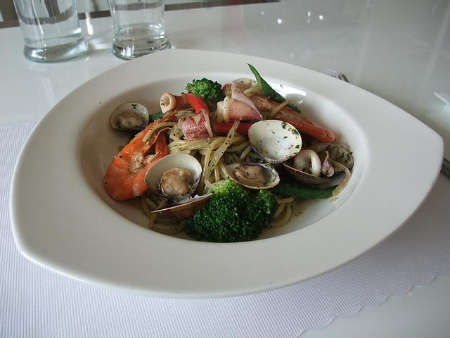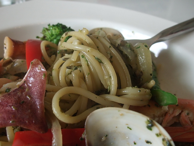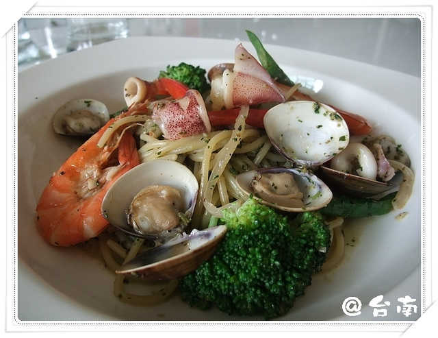 松子青醬海鮮義大利麵:很豐富的一盤海鮮麵,食材新鮮,麵條口感也有,但缺點還是主角(青醬),還不夠味,不夠濃郁!