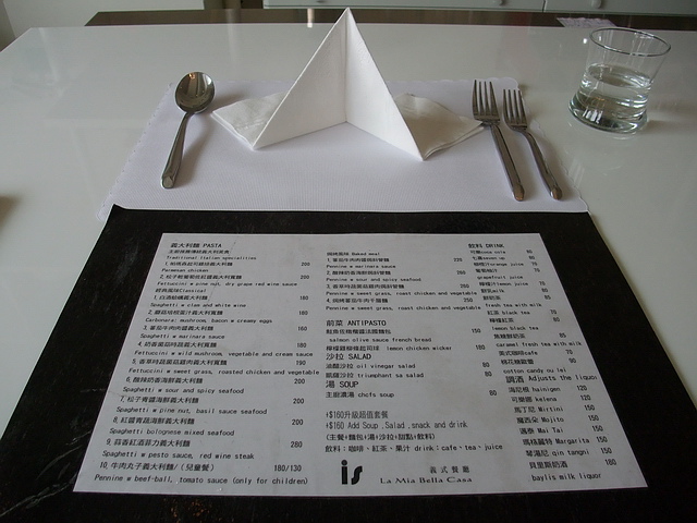 MENU(放大版):主餐價格介於$180~280間,除了義大利麵、千層麵外,亦提供前菜、沙拉、飲料等。當然,加價$160,即可升級為SET(麵包、湯、沙拉、飲料、甜點)