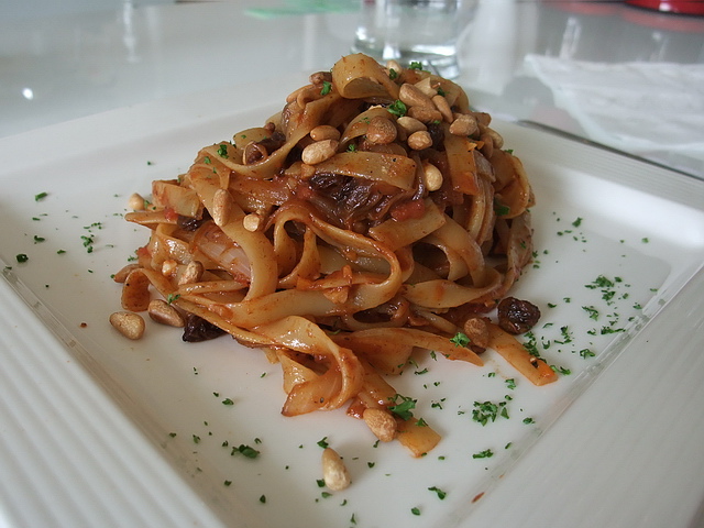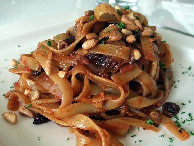 松子乾葡萄佐紅酒醬義大利寬麵:店家推薦魔女的一品,用鯷魚、紅酒而成的醬汁,搭著寬麵,屬於重口味的一品。滋味比葉子的青醬麵鹹香且好吃許多!