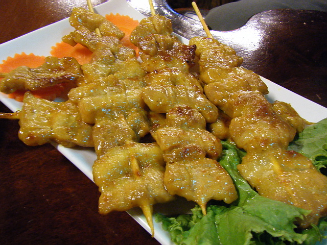 泰式烤沙爹豬肉串:調味有點偏甜,豬肉本身品質不差,就肥肉部分,整片吃起來,還是有點膩口......大家吃一串就投降嚕.....