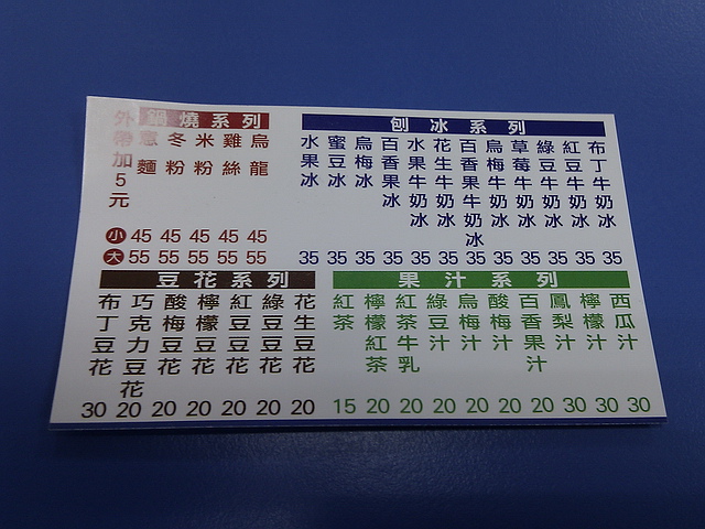 MENU:除了熱食(鍋燒意麵)外,其餘為冰品、果汁、豆花等甜點冰類。一碗麵、一份冰品,一百元有找嚕!