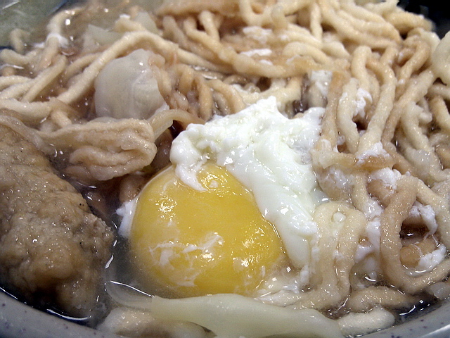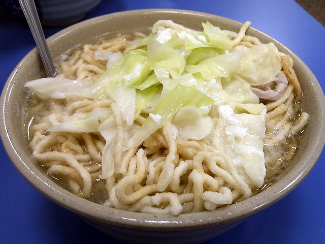 ,而配料有高麗菜、蛋、些許肉、甜不辣等。把蛋黃拌著意麵吃,比較有味道些,這是唯一讓魔女欣慰的點;對於葉子而言,選一間有冷氣的麵店,都比較值得啦