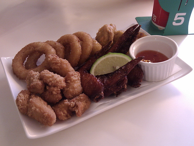 綜合拼盤:有洋蔥圈、雞塊、香辣雞翅、雞米花,很划算且好味的一道拼盤。