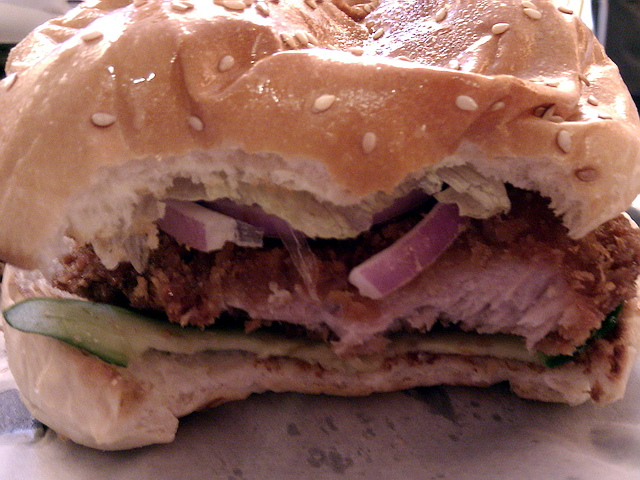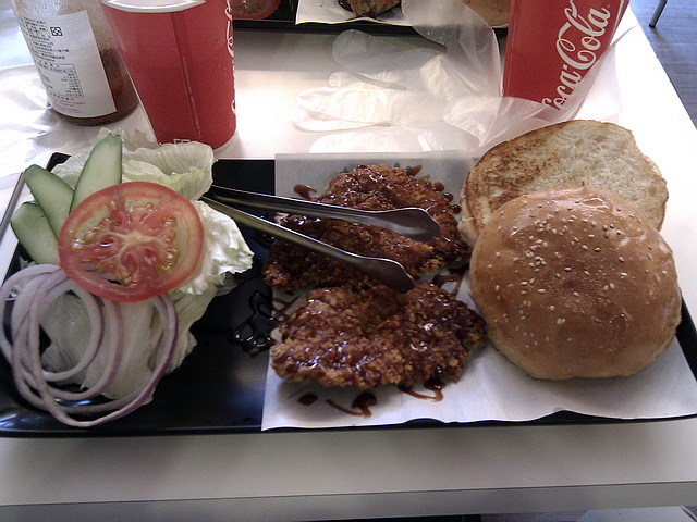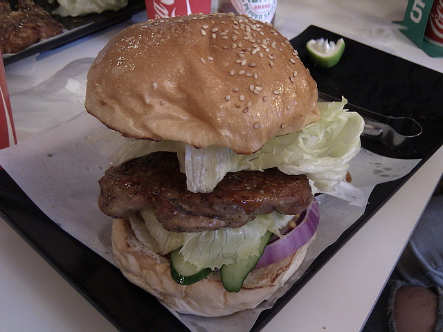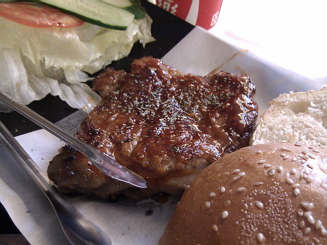 和風豬排漢堡:若不是德式香腸堡售磬,葉子也不會點到這不好吃的豬排(迷:那你為何不點雞腿排咧 XD)。豬排炸得乾硬,肉質又乾韌.....雖然,有兩塊豬排,份量十足,但不好吃也枉然咩
