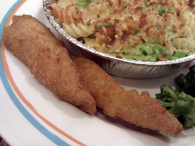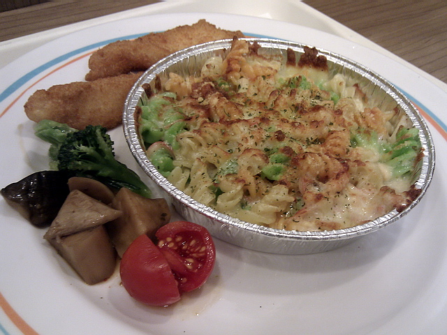 鮮鮭醬焗烤麵:除了鮮鮭醬焗烤螺旋麵外,盤附些許蔬菜,還有炸魚條。說真得,不難吃,就是讓人食而無味的感覺~葉子不禁問魔女(你怎麼想點這東西?) 魔女(一_一...我看錯惹,我把少看了鮭魚醬的醬,本來想吃鮭魚滴)