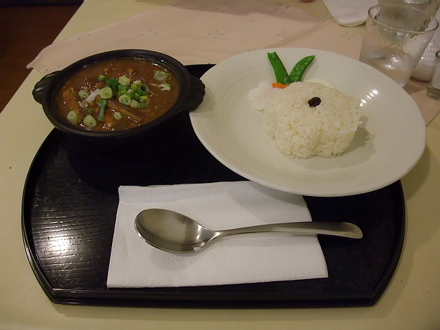 茄子起士咖哩(四辛):基底為咖哩、絞肉、茄子、起士為主。雖然是四辛,但葉子只覺得稍微辣而已(後勁),雖然口味重,但辣度、鹹味、咖哩香都各有比例,沒有失衡!葉子想,這也是我們總愛吃他的咖哩的原因吧!?若非食量小,續上三碗飯也不為過哩!