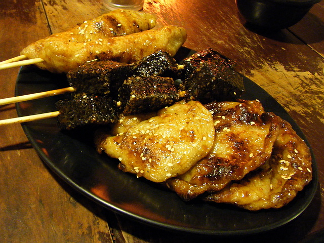 烤甜不辣、米血、黑輪:烤得比咪咪笑串燒好吃,醬汁也不會太鹹,略帶些許甜味,但也不搶食材本身的口感味道。除了米血比較硬外,甜不辣、黑輪都不錯!