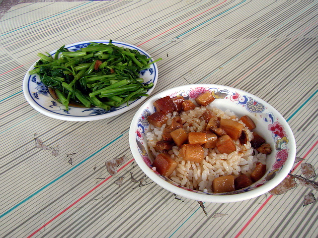 燙青菜用得醬油有點鹹,葉子吃不慣,但吃飯要有青菜,當然不浪費地,吃光光;肉燥飯,就顯得很虛,偏單純醬油味道(澆鹹)的感覺,對比於之前吃過的小食店的肉燥飯,廣仔的肉燥飯,算是葉子心中排後頭了