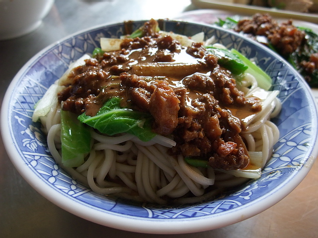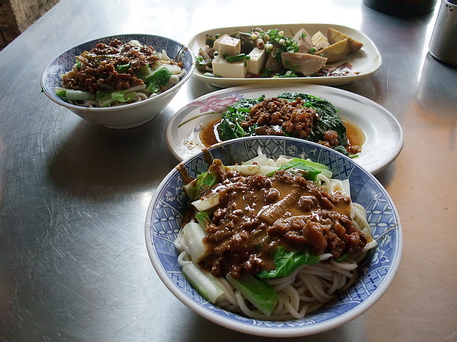 老黃陽春麵:緊鄰圓環頂肉粽旁,改天來個麵+肉粽,應該會吃得很撐吧。除了乾麵外,湯、小菜都有,當然,主角是乾麵,必點哩!